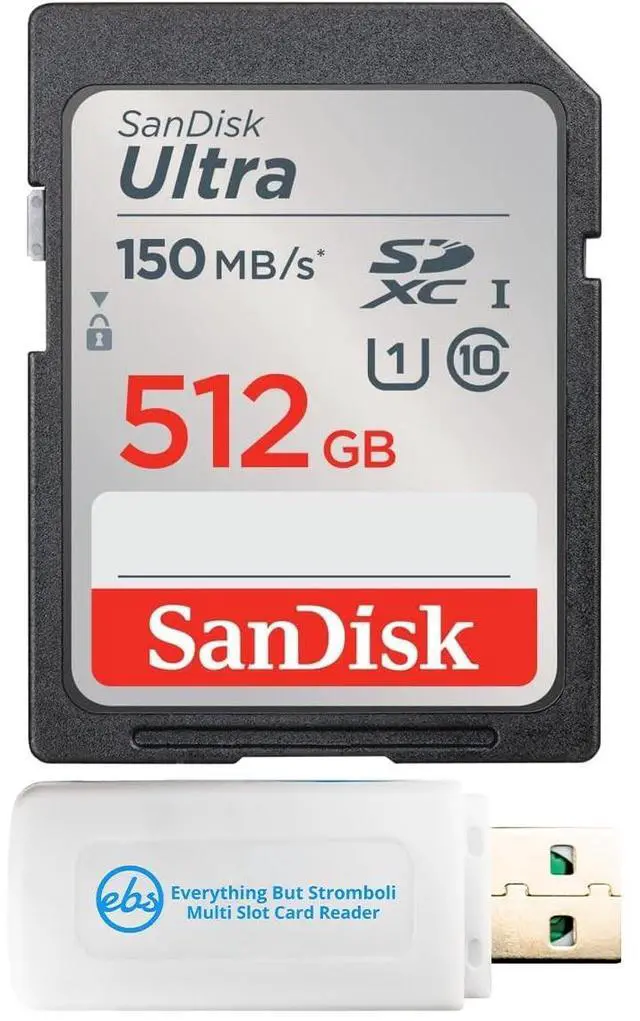 Its compact and portable design makes it easy to carry, allowing you to manage your files on the go. The SanDisk SDXC Memory card provides dependable performance, large storage capacity, and fast data transfer speeds, all in a reliable and durable package. Whether you're capturing breathtaking landscapes, recording family memories, or creating content for social media, this 512GB SD card is a must-have addition to your camera gear. Experience the perfect combination of speed, storage, and reliability with this comprehensive bundle from SanDisk and Everything But Stromboli which includes (1) 512GB SanDisk Ultra SD Card and (1) Everything But Stromboli Memory card reader.
