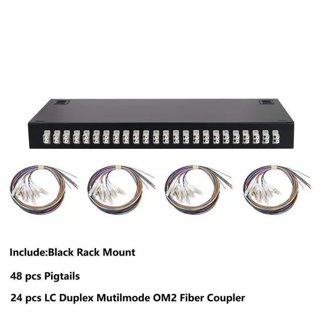 Package IncludedBlack mount, 48 pcs pigtails, 24 pcs lc duplex multimode couplers. ^^ Large Space Fusion DiscEach tail fiber has a separate winding channel, effectively protecting the fiber. ^^ Snap on DesignAchieving quick installation and maintenanceNo need to tighten screws. ^^ Thickness of Plate 1.0 mm; thickened and reinforced cold rolled sheet, sturdy and stableCorrosion resistant coating, long service life. ^^ Widely UsedData centers, premise installations, optical fiber LAN, WANtelecommunication and data processing networks CATV, instruments, communication system.