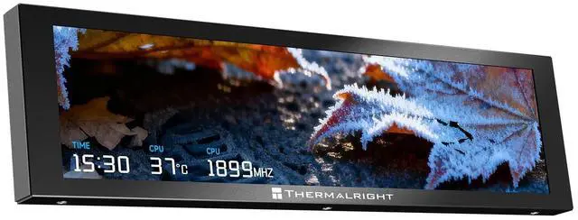 9.16 inch display; 1920480 resolution bar screen provides a wide canvas for showing system temperatures, clock speeds, fan speeds and other real-time PC statistics ^^ Real-time hardware monitoring; bundled software lets you create layouts that display CPU and GPU usage, temperatures, memory and network activity so key information is always visible at a glance ^^ USB Type-C connection; one cable carries both power and video signal from the PC, simplifying installation and helping keep the inside of the case tidy ^^ Customizable visuals and animations; supports displaying static images, animated GIFs and video clips so you can combine system monitoring with themed artwork for your build ^^ Flexible installation options; slim 9.16 inch (L251 x W68 x H17 mm) screen and included mounting accessories allow placement along the side of the motherboard tray, near radiators or behind a glass panel in desktop PC cases