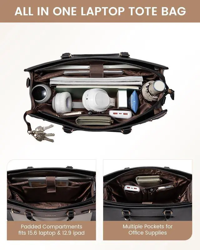 Large Capacity Tote BagThe laptop bag for women measures 17.5" L x 6.4" W x 12.5" H and has a secure zip-top closure. It provides ample space for daily and office essentials, such as a mouse, laptop, A4 files, pens and water bottle. ^^ Separate Laptop CompartmentThe office bag for women features a separate padded compartment liner for 17-inch laptop. The dedicated space keeps your computer isolated from other items, minimizing the impact from bumps and scratches. ^^ High Quality & DurabilityThis laptop tote purse is made from high-quality, water-resistant PU leather with polyester lining.