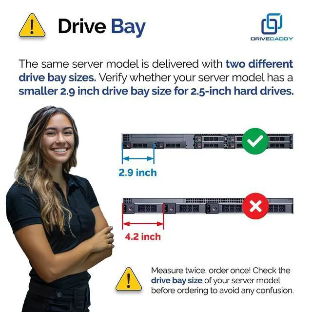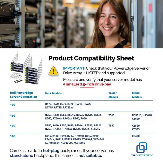 Please verify that your server supports the smaller 2.9 -inch hot-plug drive bay before purchase. PowerEdge 17th Generation smaller 2.9 -inch hot-plug drive bayR470 tray, R570 frame, R670 caddy, R770 tray, R6715 mount, R6725 case, R7715 bracket, R7725 caddy, R7725xd sledPowerEdge 16th Generation smaller 2.9 -inch hot-plug drive bayT560 caddy, R660 tray, R6615 frame, R6625 enclosure, R7615 holder, R7625 carrier, R760 case, R760xa chassis, R760xs mount, R860 bracket, R960 framework, HS5610 support, HS5620 caddyPowerEdge 15th Generation smaller 2.9 -inch hot-plug drive bayR350 tray, R450 frame, T550 enclosure, R550 holder, R650xs carrier, R750xs case, R650 chassis, R750 mount, R750xa bracket, R6515 framework, R6525 support, R7515 caddy, R7525 tray, XE8545 framePowerEdge 14th Generation smaller 2.9 -inch hot-plug drive bayR340 enclosure, R440 holder, R640 carrier, R740 case, R740xd chassis, R840 mount, R940 bracket, R940xa framework, R6415 support, R7415 caddy, R7425 trayOther systems smaller 2.9 -inch hot-plug drive bayXC