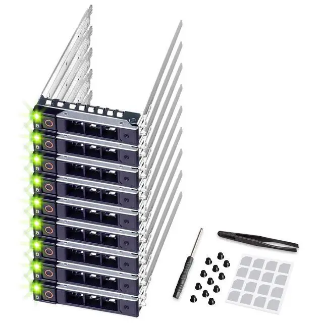 Quick and easy setup with the DRIVECADDY hot-plug caddyPress the release button to open the handle, then slide the hot-plug caddy into or out of the server. The DRIVECADDY 2.5 -inch hot-plug tray is designed for connecting a hard drive (SAS/SATA/SSD/NVMe, depending on your server and backplane) to a server backplane. If your server backplane is connected to a RAID controller (such as Dell PERC), RAID volumes can be created or adjusted through the controller configuration menu after installation. Design and packaging DRIVECADDY 9-pack drive enclosure brackets Compatible with Dell PowerEdge 2.5 -inch drive bays for SAS/SATA/SSD/NVMe drives (depending on system configuration) Front sticker labels 36 mounting screws Screwdriver TweezersPowerEdge servers may use different drive bay sizes.