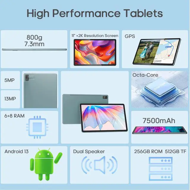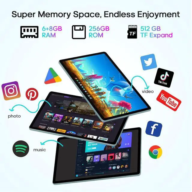 Huge Capacity StorageThis 11 inch tablet pc is equipped with 14GB(6+8virtualRAM, 256GB ROM, in addition, this android 13 tablet also supports TF/SD cards with a maximum capacity of 512GB to expand the storage space to meet your more use needs, making it easy for the tablet to switch smoothly between more apps.
