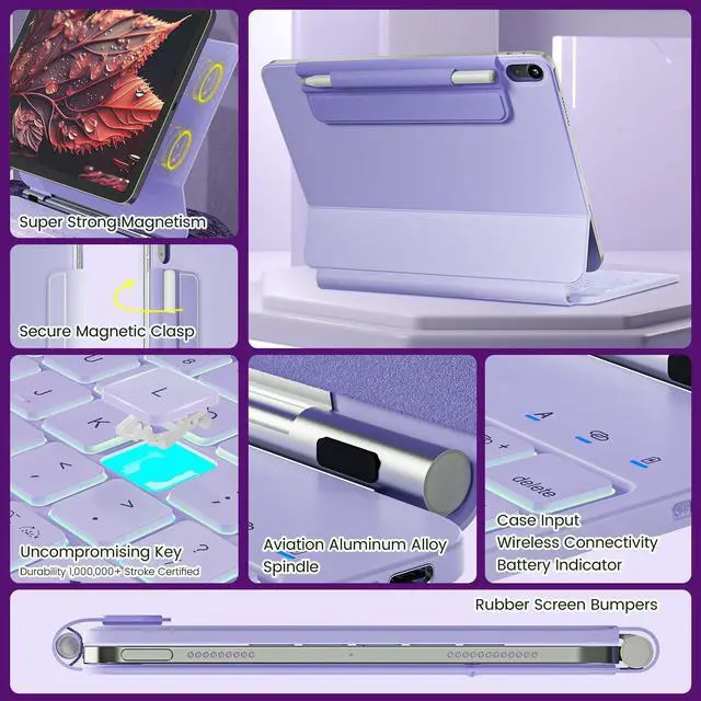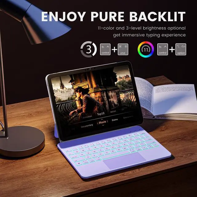 ^^ Quick-Set Magnetic Stand: Ultra-strong magnets seamlessly combine case and tablet to let you easily open the floating cantilever stand to the perfect angle for typing or browsing ^^ Backlight andshortcut key11-color backlight keyboard with shortcuts - fluidly and accurately typing on the lighted keyboard for iPad 10th generation even in a dark room, ergonomic keys, 11 colors of backlight, and three adjustable backlight brightness levels give you a comfortable typing experience. No more searching around for basic functions, be more efficient with a full row of PadOS shortcuts to adjust brightness levels, change backlit colors, media, volume control, and more.