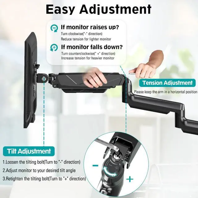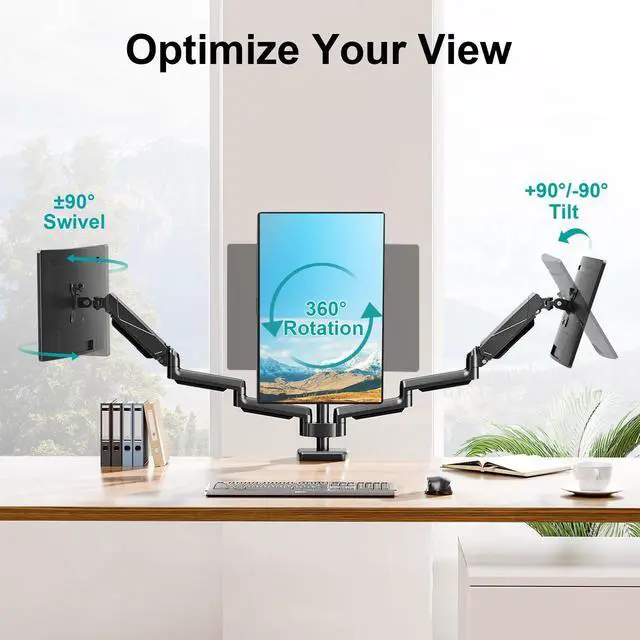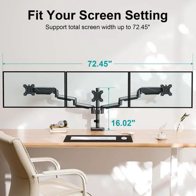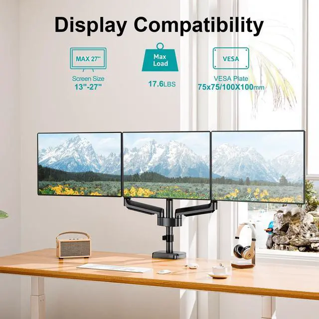 Universal Compatibility and Premium Heavy-Duty Base - MOUNT PRO monitor mount for 3 monitors fits for 17"-27" computer monitors with VESA 75x75mm and 100x100mm, but not compatible with 1000R/1500R/1800R curved screens. Each arm supports 4.4 to 17.6 lbs. Upgraded sturdy base provide more stability, strong enough to hold three monitor displays. ^^ Full Motion Gas Spring Monitor Arm - This triple monitor stand features tilt +90/-90, swivel +90/-90, rotate 360 and height adjustment. Customized your view angle with the articulating arms, offering the best viewing angle and more comfort. ^^ Desk Space Saver - 3 monitor desk mount can free up much more valuable work space comparing with normal monitor stand by holding up three screen in space.