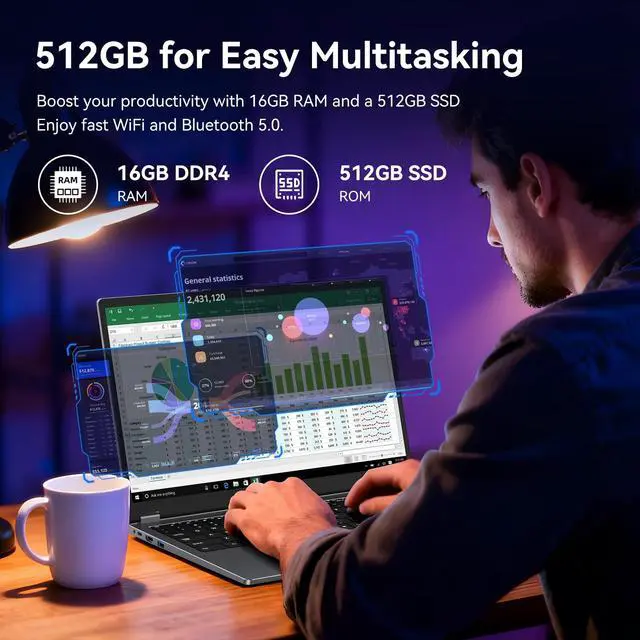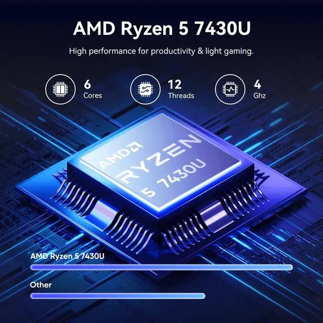 ^^ Powerful AMD Ryzen 5 7430U Processor for MultitaskingTackle demanding workloads with the 6-core, 12-thread AMD Ryzen 5 7430U processor (up to 4.0GH z). It effortlessly handles complex multitasking, creative software, business applications, and entertainment, providing a consistently fast and responsive experience. ^^ 16GB RAM & 512GB SSD for Desktop-Level SpeedNever slow down. The office laptop substantial 16GB DDR4 RAM allows seamless switching between dozens of apps and browser tabs. Combined with the speedy 512GB SSD, enjoy instant boot-ups, quick file transfers, and ample storage for all your projects and media.
