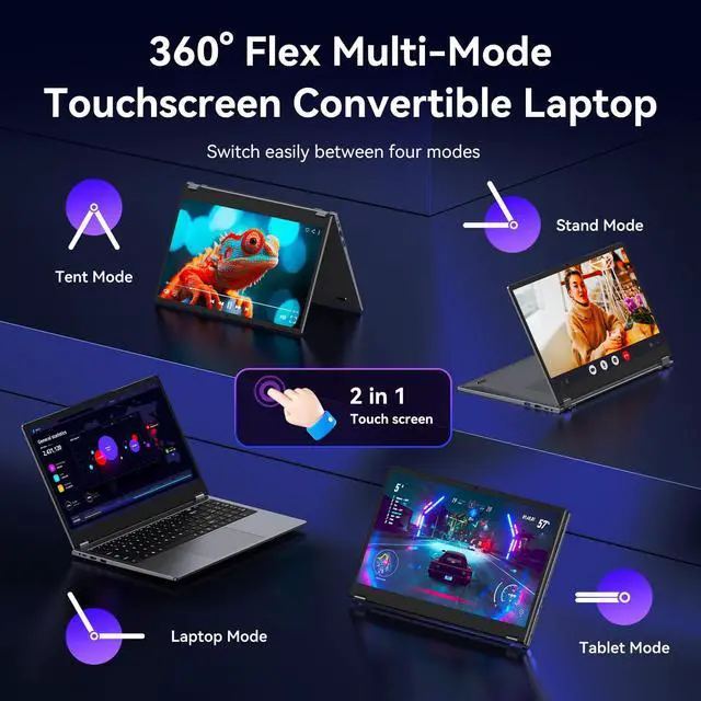 Versatile 360 2-in-1 Design with Four Usage Modes2 in 1 laptop touchscreen adapts to your every need. The robust hinge lets you smoothly switch between Laptop, Tablet, Tent, and Stand modes. Ideal for presenting, watching movies, reading, or drawing, its the ultimate all-in-one device for work, study, and creativity. ^^ Ultra-Responsive 120Hz Incell Touchscreen for Precision WorkBusiness laptops experience flawless touch interaction with our advanced Incell display. Featuring 2600 touch channels and a 120Hz sampling rate, it delivers incredibly low latency, superior accuracy, and smooth pen trackingThe 15.6 -inch Full HD (1920x1080) touchscreen responds instantly to your touch, making navigation, drawing, and detailed note-taking intuitive and natural.