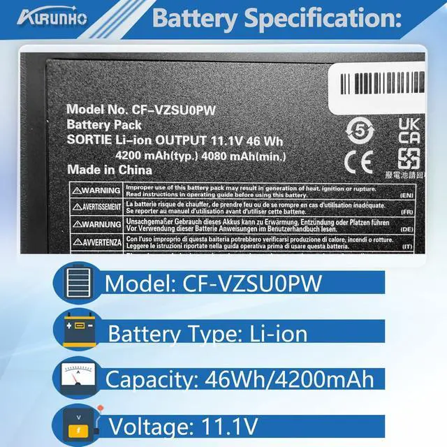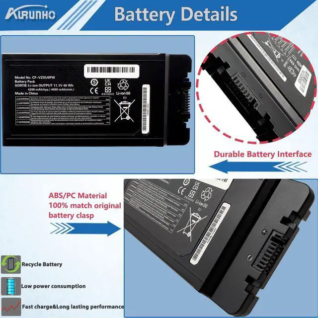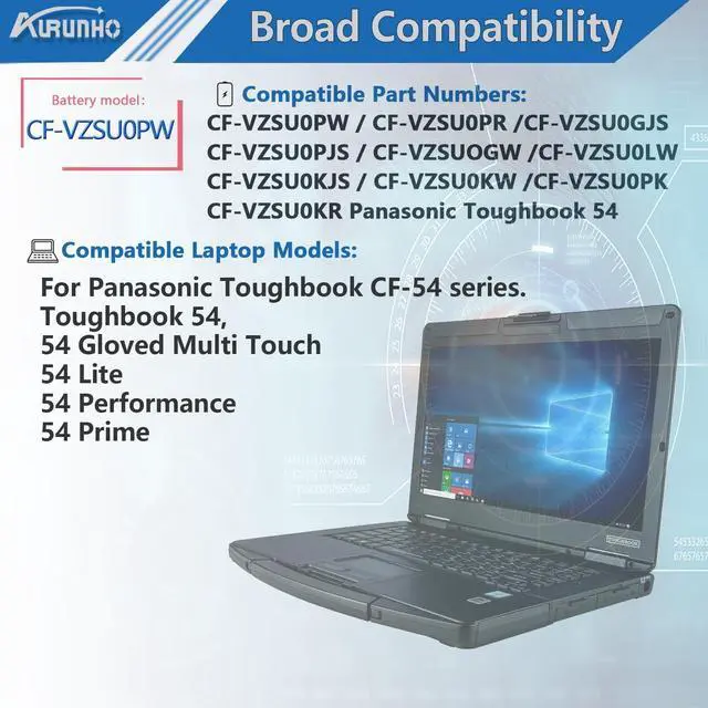 Color: Black. 100% brand New from Manufacturer. ^^ Fits Modelsfor Panasonic Toughbook CF54 CF-54 MK1 MK2 MK3 Series for Panasonic Toughbook 54 Series (54 Gloved Multi Touch, 54 Lite, 54 Performance, 54 Prime Series) CF-54F9001KM CF-54G2999VM CF-54F0961NE CF-54F0961VM CF-54A0005CM CF-54D2912VM CF-54D0005KM ^^ Compatible P/NCF-VZSU0GJS, CF-VZSU0PR, CF-VZSU0PW, CF-VZSU0GW, CF-VZSU0KJS, CF-VZSU0KR, CF-VZSU0KW, CF-VZSU0LW, CF-VZSU0PJS, CF-VZSU0PK, CF-VZSUOGW, CF-VZSUOLW, CF-VZSUOPW ^^ SecurityALL of our battery is CE, FCC, RoHS Certified. And have passed a series tests of short circuit, overheating, and overload protection before shipments for safety.