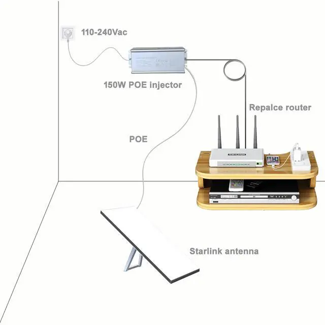 High-Power 150W POE Injector Delivers stable and efficient power to Starlink V2 and V3 Dish antennas through a single ethernet cable for the replacement of Starlink router. Supplies power and data via one single ethernet cable to Starlink V3 Dish effective distance is 328ft (100m) and expands network to connecting your computer, new router, switch and other devices. ^^ Plug-and-Play with Wide AC Input Supports 100-240V AC input for quick, hassle-free setup anywhere in the world. Wall-mounted installation, suitable for use in RVs, boat cabins, living rooms, and other indoor spaces.