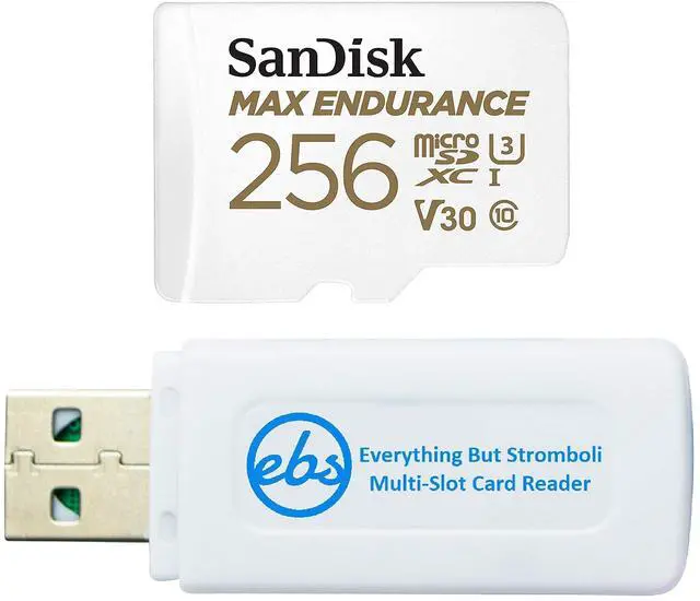 Bundle includes (1) 256 GB microSD SanDisk Max Endurance memory card with adapter and (1) Everything But Stromboli Multi-Slot Card Reader - Includes SD, Micro SD, M2, and MS slots for easy transfer.