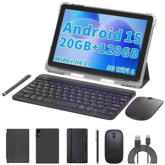 Please note: Android 15 is the official version, not the go version. ^^ HD IPS Touch Screen + Widevine L1Tablets features a 10.1 inch 1280x800 HD IPS display to enhance screen clarity and immerse you in vivid visuals. 10.1 inch tablet is Widevine L1 certified for Netflix, Prime Video, TikTok, Disney+ and Youtube, among other popular platforms for smooth viewing of Full HD content. ^^ 20GB + 128GB + 2TB ExpandableThe Android tablet comes with a memory combination of 20GB (4GB + 16GB virtual memory) RAM + 128GB ROM, which allows you to easily run a wide range of software and keep multiple applications running smoothly. It supports 2TB of expandable memory for saving tons of pictures, videos and music. The tablet is Google GMS certified and allows you to download tons of apps from the app store. ^^ 5G WiFi 6 + BT 5.0 + 6000mAhOur Android 15 Tablet supports 2.4G /5G WiFi 6 and Bluetooth 5.0 for a more stable and faster connection, with a 6000 mAh high-capacity battery, it's the best companion for outing and traveling. With 2MP front camera and 8MP rear camera, you can take beautiful photos and enjoy clear video chat.