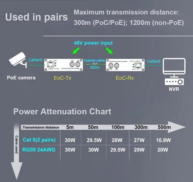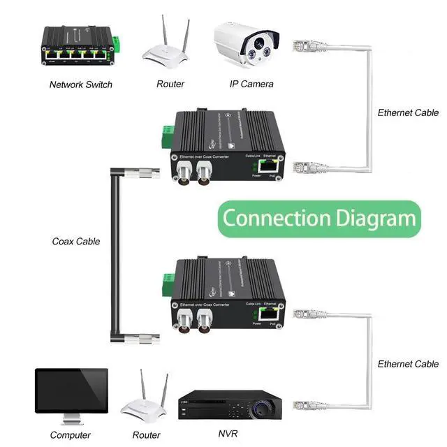 Coax: Transmits 10/100Mbps full-duplex Ethernet data up to 300m (with PoE+) or 1200m (without PoE) via existing coaxial cables, eliminating the need for expensive rewiring. ^^ Dual Power Options (PoE+