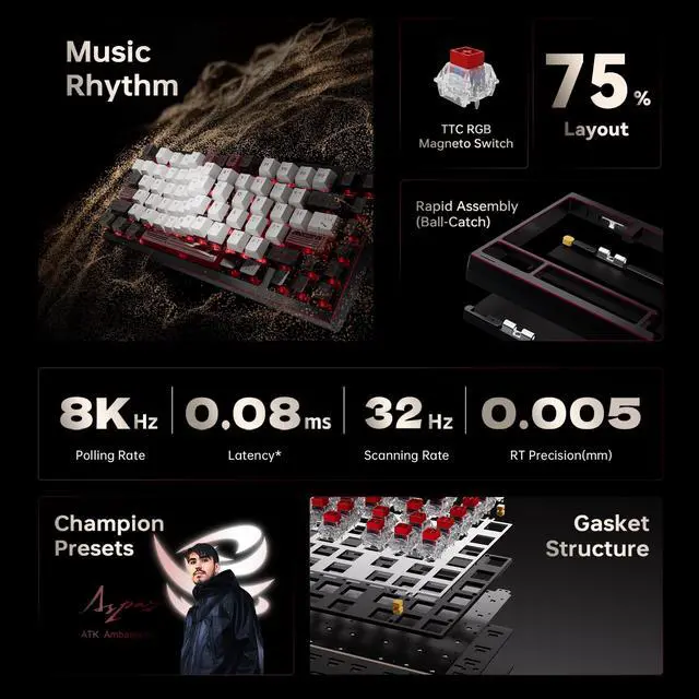 The ATK EDGE 75 HE is a high-performance 75% eSports keyboard engineered for precision and speed. Featuring a gasket-mount structure with Ball-Catch rapid assembly, it delivers responsive and satisfying keyfeel. Rapid Trigger (RT) actuation is adjustable anywhere between 0.005 mm and 3.3 mm in fine 0.005 mm increments, empowering gamers to optimize actuation for gameplay or typing comfort. With blazing-fast 32 kHz scanning, 8 kHz polling, and a response latency as low as ~ 0.08 ms, this keyboard ensures lightning-quick inputs. The CNC aluminum chassis with polished chamfers provides both durability and premium aesthetics.