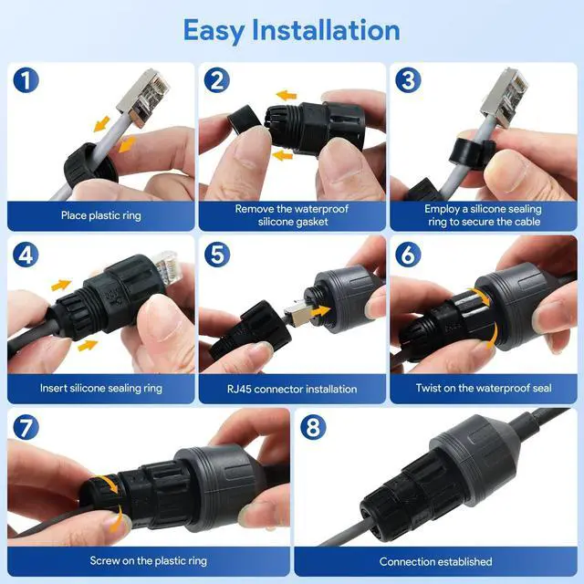 ^^ *Easy Installation Guidelines: For optimal performance, use a single Cat6 or higher Ethernet cable without any couplers or extenders to minimize contact resistance. The recommended maximum cable length is 175 feet (50 meters). If you're using crimped cables, ensure the RJ45 connectors are securely attached. When installing the waterproof socket, handle cable ends carefully to avoid twisting or damage.