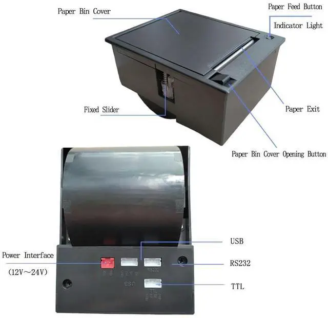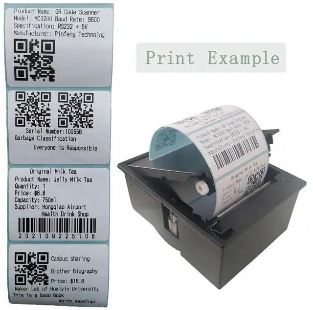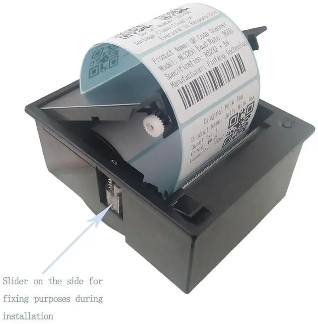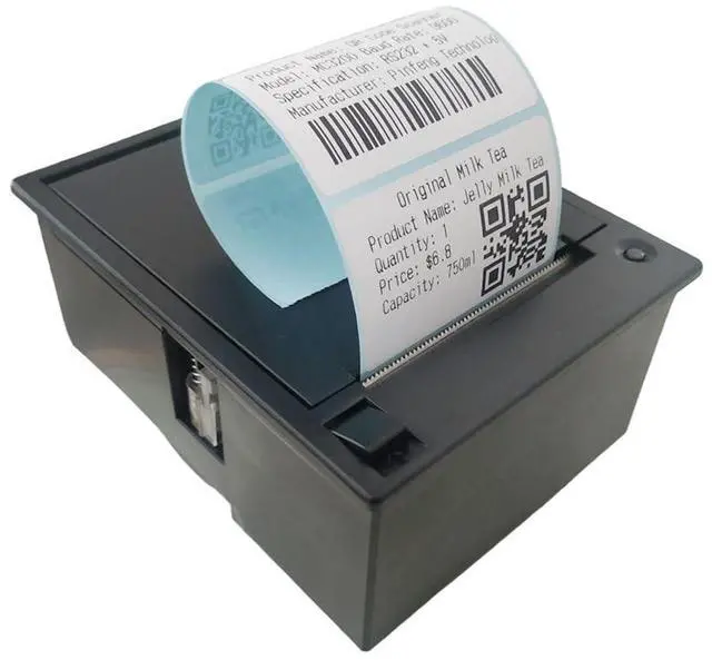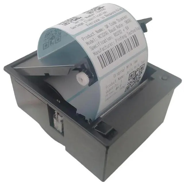 This embedded thermal label printer can be flexibly applied to self-service vending machines, supermarkets, retail stores and other application scenarios that need to print product information and paste it on the outer packaging of the product. The printer provides TTL+USB+RS232, three different types of interfaces, which can be connected to Android, MCU, WIN system and other platforms for secondary development. The product can be embedded on the panel of your device for printing needs. The product is powered by 12V3A, which is very suitable for connecting with MCU, Android, Linux and other platforms.
