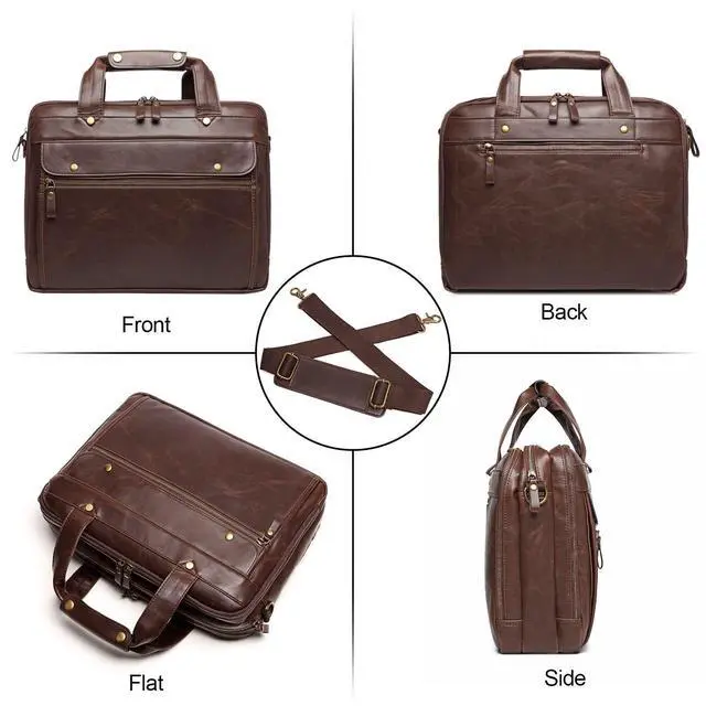 Dimension: The size of this retro laptop messenger bag is 16.5L *5"W * 13.2"H, Weight: 3.0 lbs. Inner padded laptop sleeve fits most laptops up to 15.6" and cohesive seal ensures it to be steady. ^^ TRIPLE ZIP COMPARTMENTS 1 large padded compartment for laptop. 4 large compartments for A4 magazine, file folders, significant articles, notebook. 4 inner slip pockets for phone, charger, wallet, mouse. 4 inner card slots for different cards. 3 inner pen slots for different color pens. ^^ TROLLEY COMPATIBLEThe compatible belt at the back of mens leather laptop briefcase can be easily fit into luggage trolley, freeing your hands and bringing you comfort and convenience for business trips and travel. ^^ REMOVABLE STRAP & WIDELY-USEThe business laptop bag comes with a padded shoulder strap, its removable and adjustable. You can use it as a stylish briefcase, laptop bag, messenger bag, computer bag, satchel bag, shoulder bag and crossbody bag according to your preferences. ^^ PERFECT FATHER'S DAY/BIRTHDAY GIFTThis vintage leather laptop bag can keep everything you need at work in the right place. Bosidu leather briefcase will be a great gift choice to your husband, father, boyfriend, brother and yourself on Father's Day, Valentines Day, Thanksgiving day, Christmas, New Year, Birthday or other Festival.