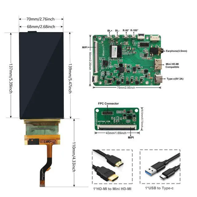 Tips: Must connect with a HDMI signal source to display images and play videos. ^^ OLED Display Technology OLED display technology screens can present purer blacks, and more realistic picture quality in high brightness impressions, restoring natural colors and reproducing vivid natural images. ^^ 2K OLED Display 2K Flexible Screen adopts a 2880*1440 high resolution OLED screen. The screen delivers a vivid image, clear motion and details, it brings transparent color performance and bright highlight details showcasing. ^^ Upgraded Version & Wide CompatibilityWith upgraded chip, this bendable screen is compatiable with all systems like Mac OS, Windows, Linux, Rpi, Ubuntu, Xbox, Switch, Camera and so on. The display orientation adjusting button allows you to control the image freely, satisfying your different needs in various occasions. ^^ Wide Range of ApplicationsInstall your flexible screen on cups, hats, cars, backpacks, handbags, clothes, etc., to display different images and personality. It can also be displayed in shops and windows as an advertising display board for displaying products. ^^ Package including1*flexible screen1* driver board1*USB to Type-c cable, 1* HD to Mini HD cable.