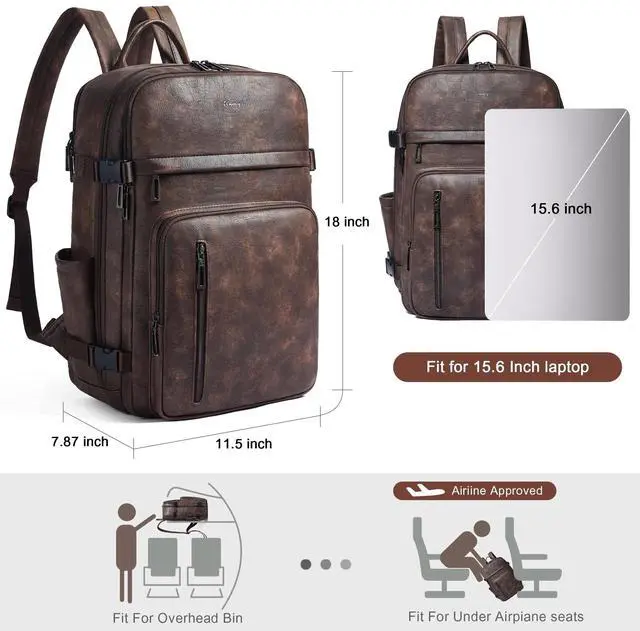 & fee-free travel: sized at 18.00" x 11.50" x 7.87" and just 2.25 lbs, this stylish leather travel backpack meets most airlines' personal item requirementstake it right on the plane for free and save money on all checked baggage fees.