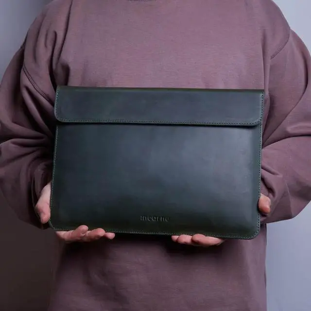 ^^ Double Layer Protection Felt + Leather Rugged vintage leather exterior shields against impacts, while the soft felt lining cradles your MacBook to guard against scratches, scuffs, and surface damage. ^^ Timeless Professional Aesthetic Rich green tone with hand-stitched edges creates a luxurious yet functional sleeve. Complements both modern office attire and casual creative setups with effortless class.