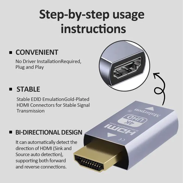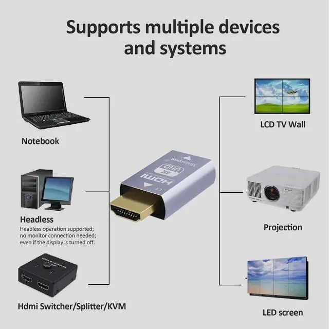 Bi-directional EDIDthe source can be male or female connect. Pixel Format HDMI EDID tell Windows that it is a monitor of the specified resolution, and then pass through the video data to your real monitor. even turn off or disconnect the real one, the device will tell Windows that it is still connected and Windows will not try to rearrange things. it does in fact work with DP to HDMI adapters flawlessly ^^ Using it with not always connected to a screen clients (Mac mini, raspberry Pi, NUC, Jetson Nano) connected to a 3840p monitor.