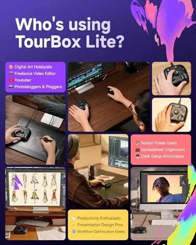 Meet the TourBox Lite Oasis Series. Designed to bring a splash of color and inspiration to your workspace, this compact controller now features vibrant, soothing color options to fuel your creativity. Beyond its inspiring hues, it delivers the same cable-free flexibility with Bluetooth connectivity for laptop, desktop, or Win tablet setups. With a compact, ergonomic design and intuitive control layout, it remains the smarter, more comfortable way to create. Enjoy the same seamless integration with top creative softwares, smart preset auto-switching, and custom macro controlperfect for illustration, light editing, and daily digital workflows.