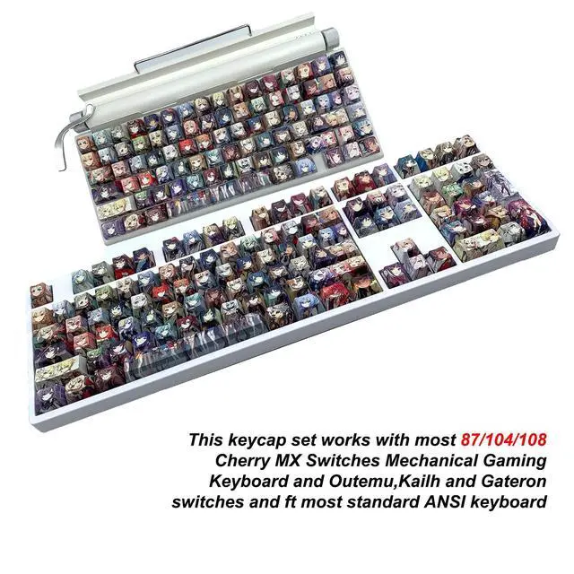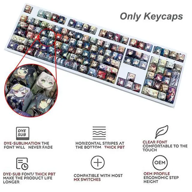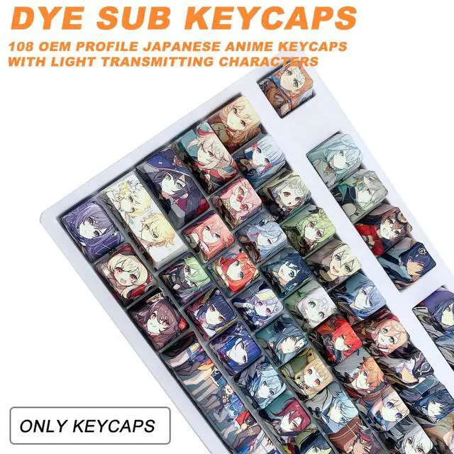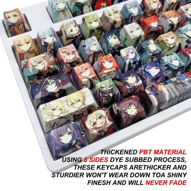About this itemGood MaterialThe keycap is made of 1.4 mm thick PBT material. Super wear-resistant, no fading, strong corrosion resistance, clear characters, dedicate touch with drawing process. Advanced five-sided sublimation technology makes the pattern not fade. Widely CompatibleThe anime key caps fit standard US layout mechanical keyboard (61/87/104/108 keys) suitable for MX switches such as Cherry MX, Kailh, Outemu, Gateron, etc. You can confirm with us if you are not sure about the size of the keycaps. OEM Profile KeycapsThe OEM height makes you more comfortable to use and feels excellent.