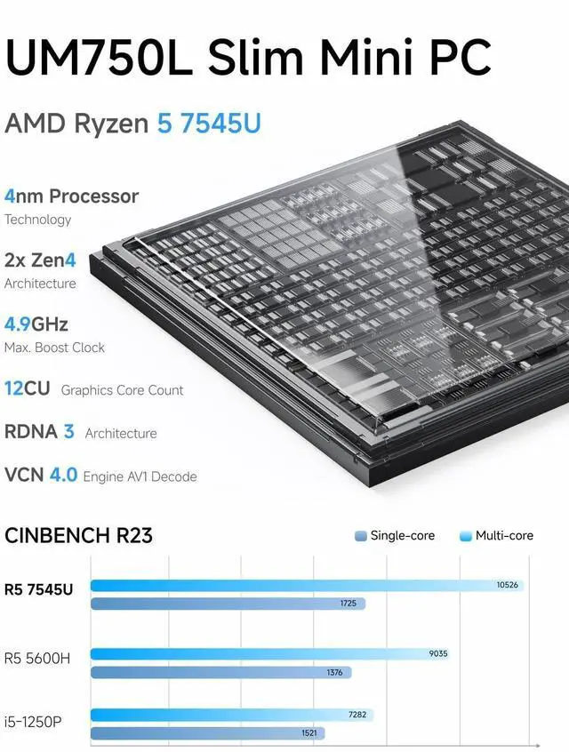 High proformance ProcessorThe UM750L Slim Mini PC feature with AMD Ryzen 5 7545U (6C/12T up to 4.9G hz) processor. The faster performance can handle productivity tasks smoothly. It widely used for image editing, browsing, light games, watching movies, daily life, programming etc. ^^ Triple 8K Display OutputThis Mini PC come with three video outputs, 8K@60Hz display output via HDMI 2.1 and USB4 Port, 4K@60Hz display via DisplayPort, You can connect 3 monitors at the same time which ensures smooth navigation, responsive work processes and comfortable handling of apps and files and provide a larger and wider filed of view to improve your work efficiency.