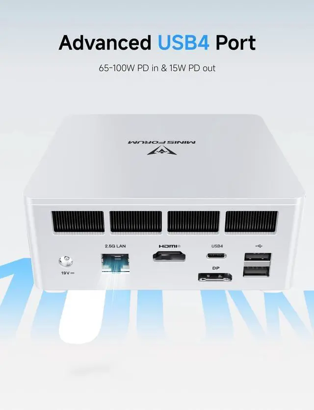 This configuration ensures smooth operation of demanding applications, effortless handling of large media libraries and capable gaming performance - all without storage-related compromises. ^^ Extensive ConnectivityThis Mini PC equipped with 1x DP 1.4 Port, 1x HDMI 2.1 Port, 2x USB 3.2 Port, 2x USB 2.0 Port, 1x USB4 Port, 1x 2.5G Lan Port, 1x 3.5 mm audio jack, 2x DDR5 SODIMM Slot, 1x M. 2 2280 PCIe 4.0 SSD Slot, which offers extensive connectivity options for various peripherals and external devices. ^^ What's in Package1x UM750L Slim Mini PC, 1x HDMI cable, 1x US Power Adapter, 1x Manual.