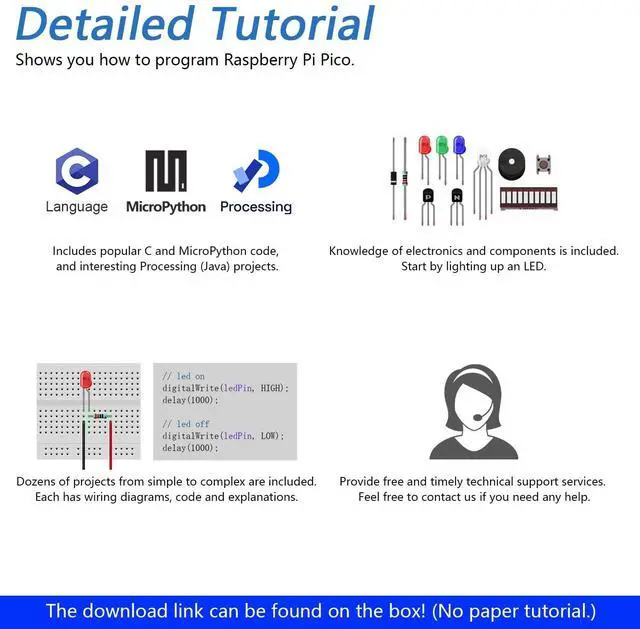 Total: Provides step-by-step guide with basic electronics knowledge (The download link can be found on the product box) (No paper tutorial) ^^ 119 Projects from Simple to
