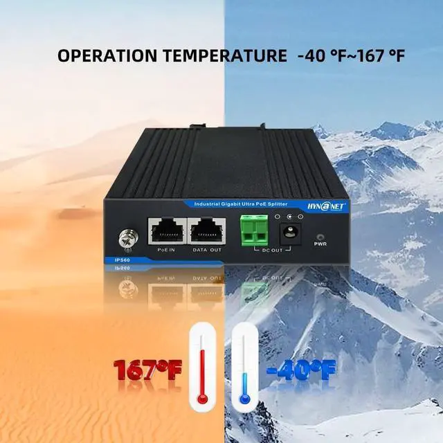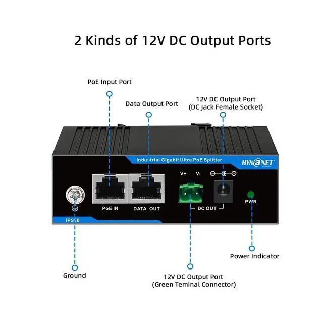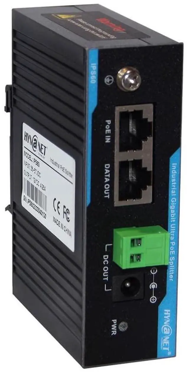 High-efficiency DC/DC converter split PoE port into 12V DC power ports and 10/100/1000Mbps RJ45 port, Plug and Play, require no configuration. ^^ Input voltage range 36Vdc to 57Vdc from IEEE 802.3 bt/at/af Power Sourcing Equipment (PSE) like PoE injector or PoE switch. ^^ Two kinds of 12V DC power output ports are available, DC Jack port( 5.5 mm x 2.1 mm) and green terminal connector. 60W PoE Input, output current 4.25A Max, power can reach to 51W. ^^ Industrial-grade design, support DIN-Rail Installation, IP40 dustproof, operation temperature -40 ~167, thermal cut off, Short circuit protection.