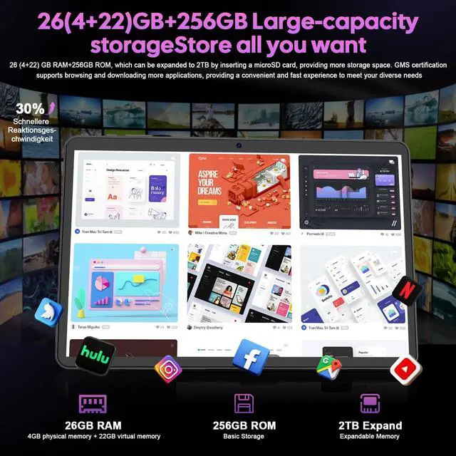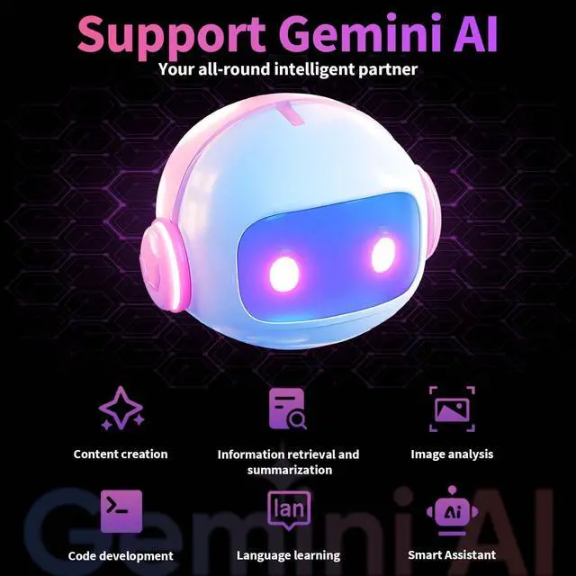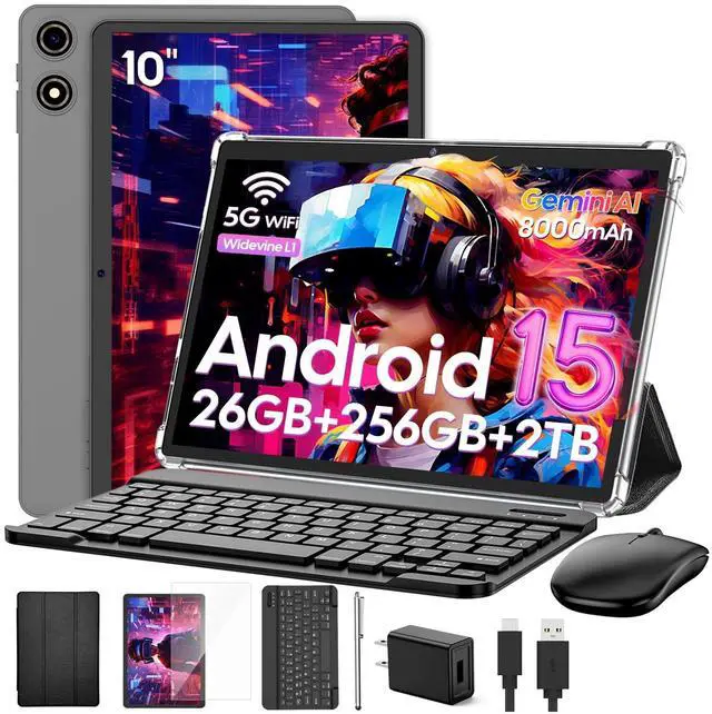26GB RAM + 256GB ROM + 2TB ExpandableThe Android tablet is equipped with 26GB RAM (4GB physical memory + 22GB virtual storage) and 256GB ROM, providing a seamless multitasking experience. It also supports expansion up to 2TB via a MicroSD card (not included), with sufficient capacity to store a large number of photos, videos and large files. This device has obtained GMS certification and supports seamless browsing and downloading of applications from the Google Play Store, enjoying a convenient and fast experience ^^ 2026 Android 15 System + Gemini AIThe tablet with keyboard is equipped with the latest Android 15 system, which enhances privacy protection and permission management, providing a smoother, safer and more personalized experience.