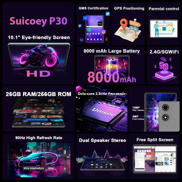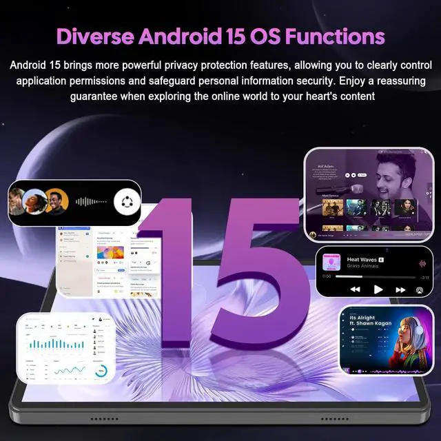 In particular, Gemini AI can be used, combined with customizable Settings such as face unlocking, split-screen function and smart widgets, making this AI tablet a reliable choice for entertainment and efficient work ^^ 10-inch IPS Display + Widevine L1+ Dual Speakers The Android 15 tablet is equipped with a 10-inch IPS display with a resolution of 1280800 pixels, providing an immersive visual and entertainment experience. With Widevine L1 certification, this 10" tablet supports high-quality playback of premium content on major streaming platforms. Equipped with dual speakers, the sound is surround and three-dimensional, with distinct layers, making you feel as if you were right in the middle of the story and enjoying all-round immersive entertainment ^^ 8000mAh Battery + 2.4G /5G WiFi+ Bluetooth 5.0T his 10 inch Android tablet is equipped with an 8000mAh large-capacity battery, offering excellent battery life and is highly suitable for travel, commuting and outdoor activities.