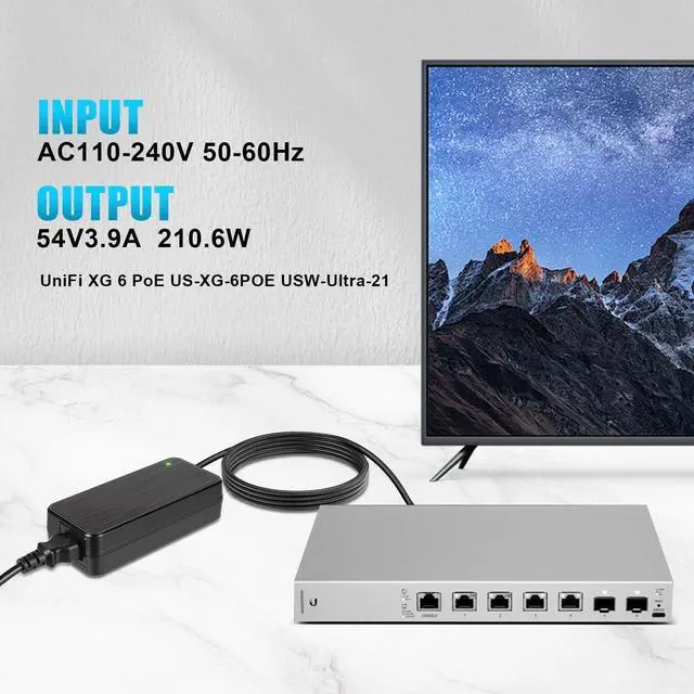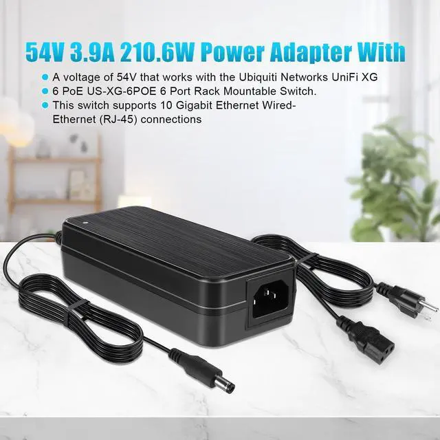This 210w ac power adapter can be used in any country with a voltage between 100 and 240 volts and a frequency between 50 and 60 hertz. ^^ 54v power adapter 210w that is compatible with Model ADS-210NX-48-1 540210E, ADS-210NX-48-1540210E ^^ 54v 210w adaptor is compatible with Ubiquiti USW-Ultra-210W USW-ULTRA-210W-EU Unifi Switch Ultra 8 Port Gigabit Poe+ Compact Layer 2 ^^ This 54v 210w power supply is approved by CE and FCC. You'll get a 30-day return policy, and 24-hour customer service. ^^ The Netgear power plug of the 54V 210W AC-DC adapter has been upgraded to prevent any issues with a loose connection.