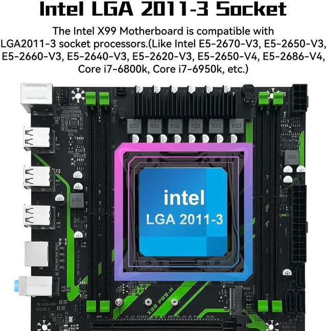 Motherboard: The X99 motherboard support Intel LGA2011-v3 Socket CPU processors (e. g. Intel i7 6950X/6900K/6850K/6800K/5960X/5930K/5820K, Xeon E5 1620/1680/2695/2696/4667/4669 V3; E5 1607/2637/2690/2697/2699/4669 V4, etc. )