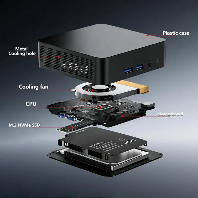Large Memory & Storage SupportMini computer features built-in 16GB DDR4 high-speed RAM and a 1TB M. 2 2280 SSD, providing ample storage and enabling faster multitasking with smooth application switching. Additionally, it is equipped with a large silent CPU fan, a copper heat sink, and a dedicated SSD cooling shield. These components work together to enhance heat dissipation, ensuring the system runs efficiently and reliably. ^^ Vibrant Graphics & Triple-DisplayMini PC windows 11 features Intel Ultra HD Graphics, supporting UHD resolution (4096x2160@60Hz) and enabling dual or triple-screen displays for seamless multitasking.