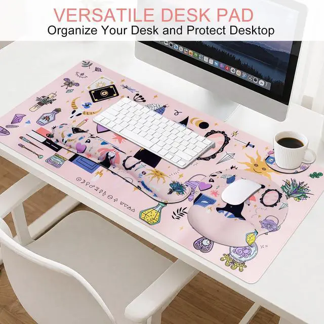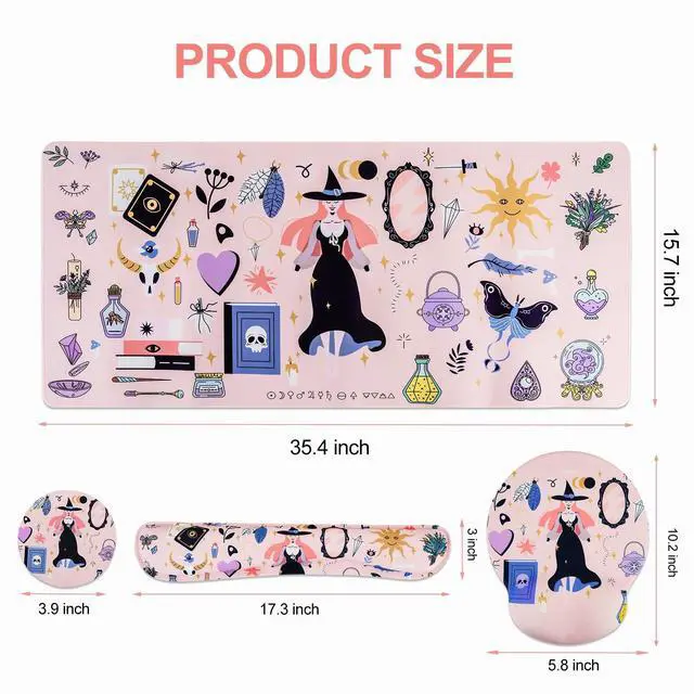 Mouse Pad: Large desk pad( 35.4 * 15.7 inch); Keyboard wrist rest( 17.3 *3inch); Wrist rest support for mousepad ( 10.2 * 5.8 inch); Cup coaster diameter( 3.9 inch) ^^ Ergonomic Design Desk PadOur floral mouse wrist rest and keywoard wrist supporting are ergonomic design, which can relieve wrist fatigue and stress, avoiding joint and muscle injuries and pain caused by long hours working or gaming. ^^ Excellent QualityOur wrist rest pad set is made of breathful and soft Lycra fabric, which can position the mouse stay where you want. The keyboard typing wrist support is made of rebound foam memory to support your wrist well. ^^ Anti Slip BaseThe keyboard typing wrist rest and mouse wrist rest are anti slip. The backing are made of PU rubber, which can firmly grasp the desk, avoid to move during use. ^^ Nice GiftOur wrist rest pad with beautiful flowers pattern, which can creat a pleasant and relaxing atmospher to relieve the fatigue of long time working. They are nice gift for graduatues, birthdays, families, friends and yourself.