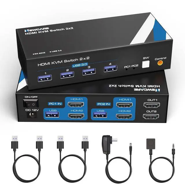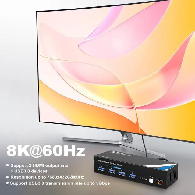 Note: Extended mode required computer support multiple monitors display. ^^ KVM Switch 2 Monitors 2 Computers USB 3.08 k HDMI switch dual monitor has 4 USB 3.0 ports, so you only need connect one set keyboard, mouse, printer, USB disk to control 2 computers. Support wireless keyboard and mouse, no need install any driver, just plug and play. The USB 3.0 port's transfer data rates max up to 5.0 Gbps per second, which it's faster 10 times than USB 2.0 port. ^^ Widely Compatible with Various System4k 120hz KVM switch 2 PCs 2 monitors are compatible with various operating system, such as Windows/Vista/XP/ and Mac OS, Linux and Unix. Support HDMI 2.1 / HDMI 2.0 /HDMI 1.4 and HDCP 2.3 / HDCP 2.2 /HDCP 1.4. ^^ Ultra HD 8K@60Hz ResolutionHDMI KVM Switch Selector support 7680x4320 @60hz(8K@60Hz), 4K@120Hz, 4K@60Hz, 4K@30Hz, 2K@120Hz, 1080P@240Hz. Video bandwidth up to 48Gbps, 8K required HDMI 2.1 cable, length less than 3m, 4K required HDMI 2.0 cable, length less than 5m.