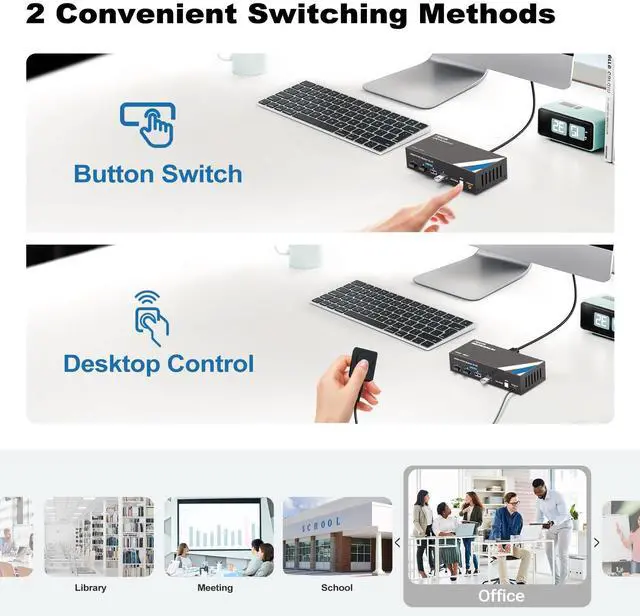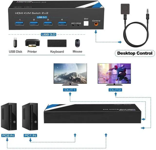 Noted: PC 1 & PC 2 can't work at the same time. Just select one of them to work. ^^ 2 Fast Ways to Switch PCsUSB 3.0 HDMI KVM Switcher support manual button and desktop controller to select HDMI input source. The related LED indicator will show which PC is active.