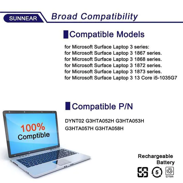 Battery type: Li-ion. ^^ Compatible Laptop/Notebook ModelsFor Microsoft Surface Laptop 3 Gen 1867/1868 13.5 Inch Keyboard Base, please check the model of your laptop before purchase.