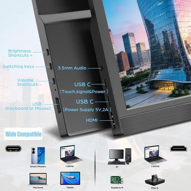 ^^ Multiple Connectivity Options: This portable laptop monitor features a variety of ports, including an HDMI input, a 3.5 mm headphone jack, a USB port for connecting a mouse or keyboard, and two Type-C input ports for power and touch signal transmission, respectively. Enjoy the versatility of connectivity! ^^