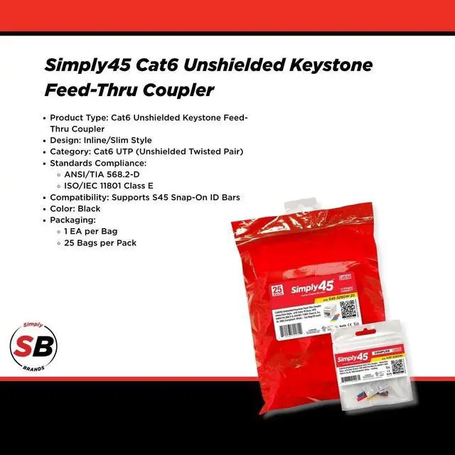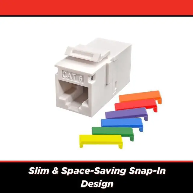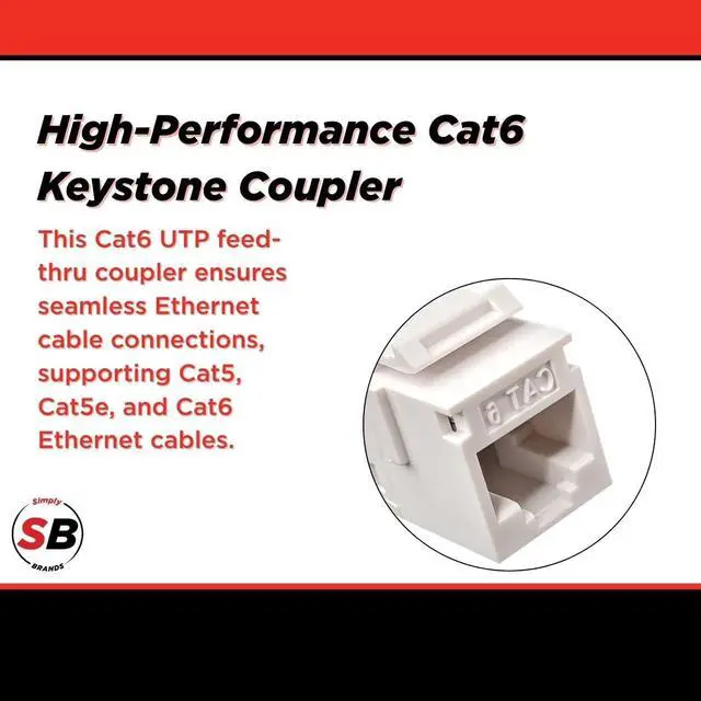 High-Performance Cat6 Keystone Coupler - This Cat6 UTP feed-thru coupler ensures seamless Ethernet cable connections, supporting Cat5, Cat5e, and Cat6 Ethernet cables for reliable networking. ^^ Slim Inline Design for Easy Installation - The compact Cat6 coupler fits RJ45 connectors, keystone wall plates, patch panels, and Ethernet couplers, ideal for home and office Ethernet setups. ^^ Certified for Industry Standards - Built to ANSI/TIA 568.2 -D and ISO/IEC 11801 Class E standards, ensuring high-speed data transmission and consistent Ethernet network performance. ^^ Supports S45 Snap-On ID Bars for Organization - Designed for structured cabling systems, this RJ45 keystone coupler allows for easy identification, improving network efficiency and maintenance.
