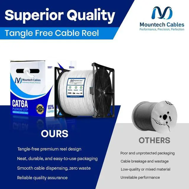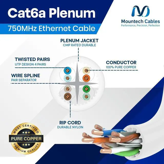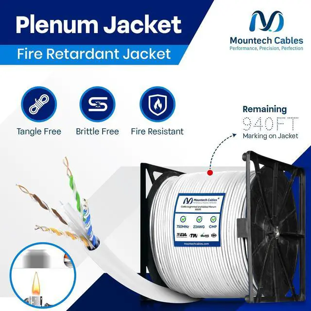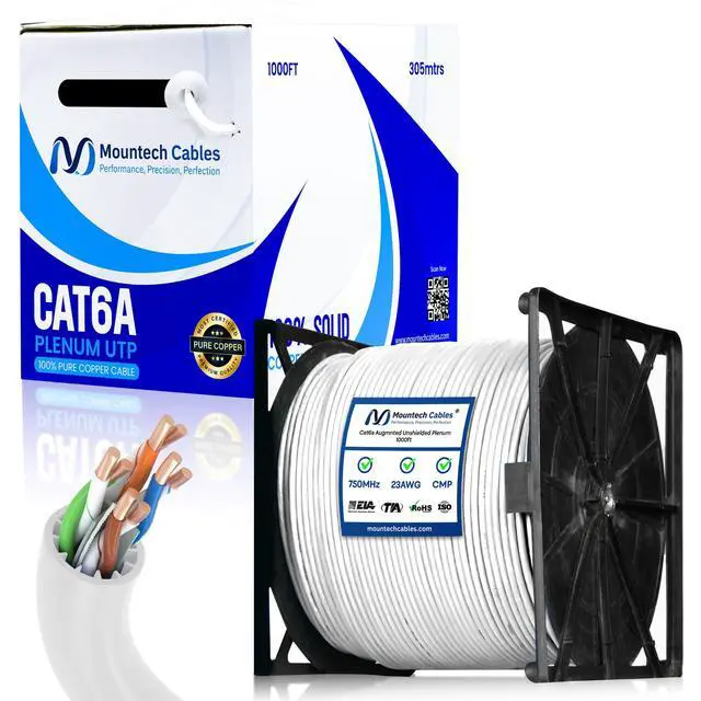 - This Cat6a plenum 1000ft ethernet cable delivers blazing-fast speeds up to 10 Gigabit with 750MHz bandwidth, ensuring smooth data transfer, gaming, and streaming without lag. ^^ % Built with pure solid copper (23AWG) for superior conductivity, minimal signal loss, and long-lasting durability. This Cat6a unshielded 1000ft plenum cable guarantees reliable and consistent performance. ^^ - Flame-retardant plenum (CMP) jacket with low-smoke and low-toxicity design. Safe for use in plenum air spaces above ceilings or below raised floors in both residential and commercial installations. ^^? -- Comes with a tangle-free reel-in-a-box design for hassle-free pulls, accurate length tracking, and mess-free setup.