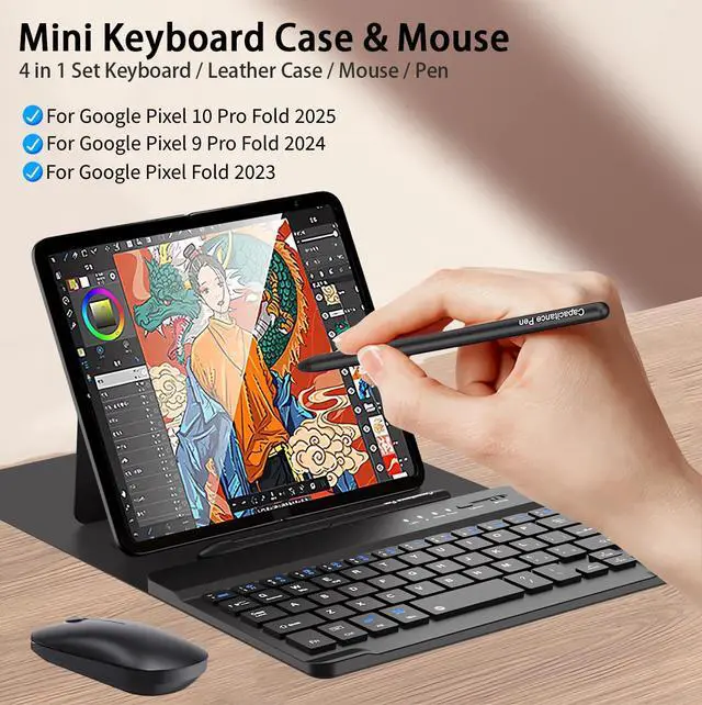 COMPATIBLE: Designed for Google Pixel Fold phone,. Include 1 PCS Detachable Wireless Keyboard, 1 PCS Folding Leather Case, 1 PCS Wireless Mouse, 1 PCS Capacitance Pen ^^