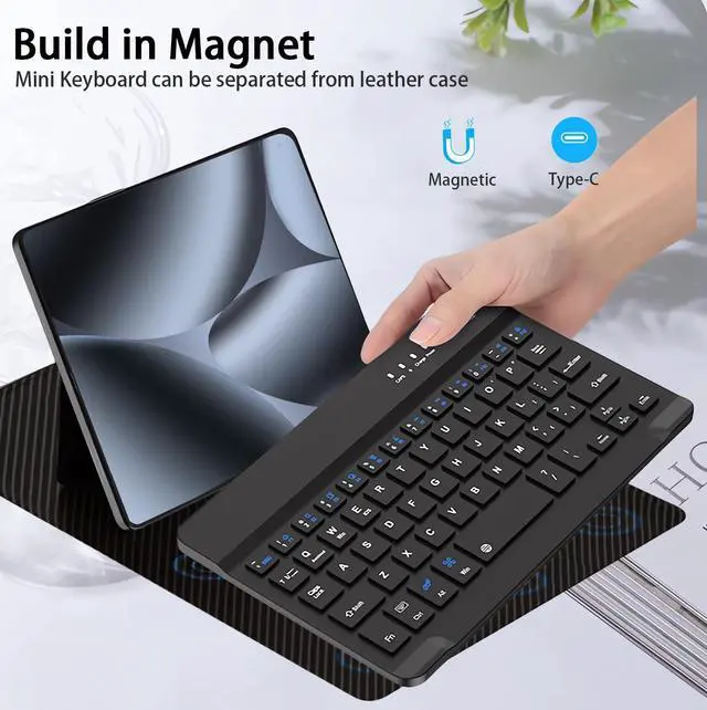 RECHARGEABLE MINI KEYBOARD: Portable keyboard is wirelessly connection without cable, the detachable compact keyboard can be split from the flip stand plain leather case. The slim keyboard case can meet your travel, office all kinds of needs ^^