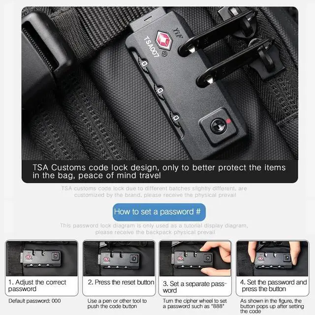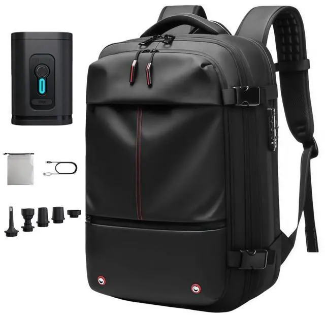 Vacuum Seal SystemThe main compartment comes with a built-in compression bag and comes with a complimentary air pump for quick vacuuming, providing more carrying space. ^^ TSA Password LockLaptops and tablets have separate TSA password locks in the compartments to protect your property security. ^^ More ColorsThere are three colors for you to choose from, black, dark green, and dark blue. ^^ One BackpackMultiple UsesNot using vacuum compression function, it can be used as a high-end backpack for work or school, and can accommodate laptops, tablets, books, etc.