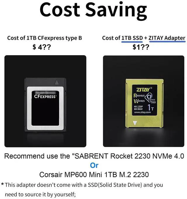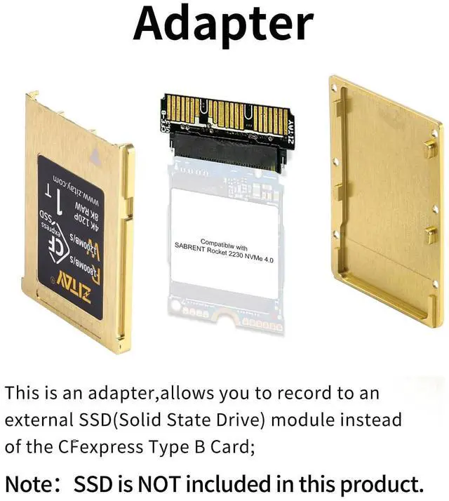 What is it? This is an adapter, allows you to record to an external SSD (Solid State Drive) module instead of the CFexpress Type B Card. This adapter can be put into the camera card slot just like a CFexpress Type B card. Hence, you need to know clearly that ZITAY CFexpress Type B Card to NVME M. 2 2230 SSD Adapter is just an adapter. This adapter doesn't come with a SSD (Solid State Drive) and you need to source it by yourself. Why should I buy your product? Cost Saving.