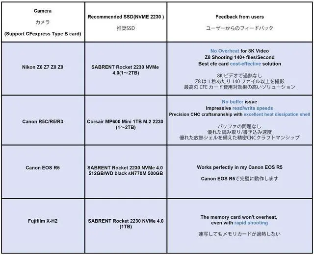 Cost of 1TB CFexpress type B card VS Cost of 1TB M. 2 2230 SSDWhat NVME SSD drives are recommended? Recommend use the Kioxia (Toshiba) 1TB BG4 / 1TB SK Hynix BC711 (firmware version must be 41000C20NVMe M. 2 2230 30mmWe can not confirm other NVMe M. 2 2230 will work or not. How fast should my SSD read and write? It depends on your NVME M. 2 SSD drive and your CFexpress Type B card reader. Our adapter support write speeds up to 1200MB/s and read speeds up to 1800MB/s.