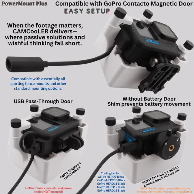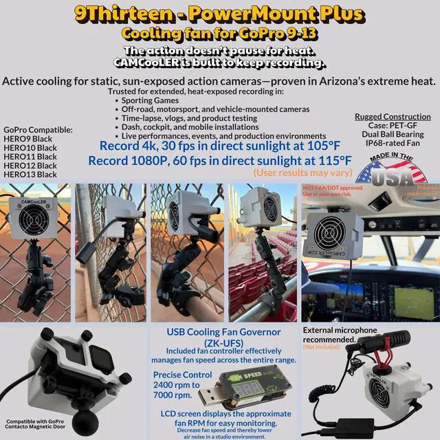 The CAMCooLER 9Thirteen is designed as an active cooling fan solution. Works with GoPro HERO9 Black, HERO10 Black, HERO11 Black, HERO12 Black, and HERO13 Black camera overheating issues when used in a static environment. Our newest model, this cooler incorporates the ability to use the GoPro Contacto Magnetic Door or USB Pass-Through Door and uses traditional GoPro fingers, GoPro Magnetic Latch Mount, or the PGYTECH Caplock action camera quick release set. Variable speed fan with included the USB speed controller. Plug in for constant speed 5000 rpm speed or use the included USB speed controller to vary the fan speed.