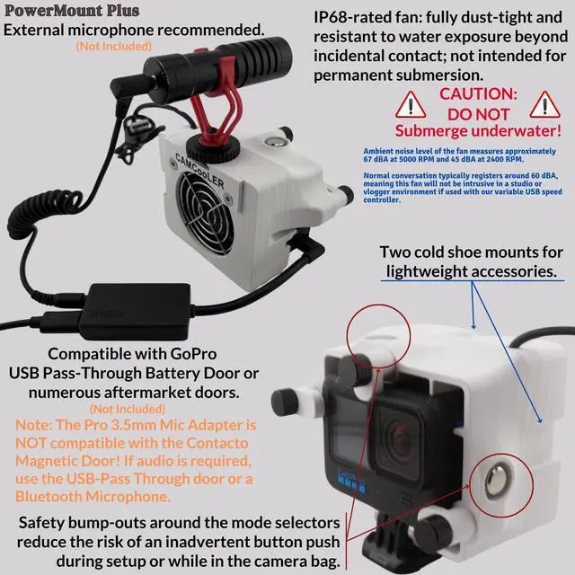 It will help keep your action camera from overheating when recording sporting events, vlogging, creating YouTube content, as a dash cam, or in a small airplane! Whether you find yourself in a cozy studio environment or basking under the scorching sun at your next event, this fan has got you covered. Made with PET-GF (Polyethylene Terephthalate) thats been reinforced with chopped glass fibers to make it stiffer, stronger, and more dimensionally stable than standard ASA version, yet remains UV-resistant and resistant to environmental stress cracking. The Cooler is fully compatible the GoPro Contacto Magnetic Door or USB Pass-Through Door and the Pro 3.5 mm Mic Adapter from GoPro.