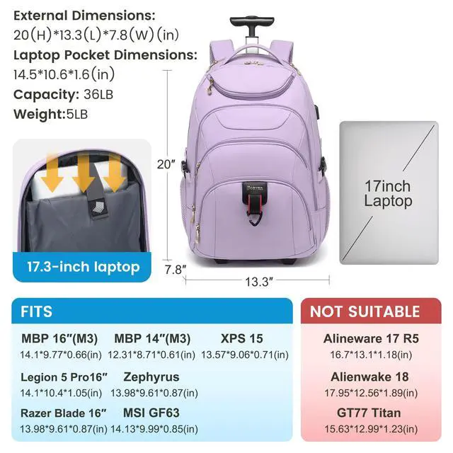 ^^ 2-in-1 Convertible Design: Designed for versatility, this wheeled backpack easily transitions between a rolling suitcase and a traditional backpack. Use the telescoping handle and sturdy rubber wheels for rolling, or switch to comfortable shoulder straps when climbing stairs. The straps can be neatly tucked into the back pocket to stay clean and avoid dragging. To prevent rain from getting inside, it's suitable to carry it on your back in wet weather making it an all-weather travel solution. ^^ SIZE REMINDER CHOOSE CAREFULLY BEFORE PURCHASE To avoid any size-related inconvenience, please double-check your laptop size and carrying needs before placing an order. Our 17.3" backpack fits most standard laptops, while the 18.4" version is significantly larger, made for extra-large gaming laptops (like Alienware 17 R5) and additional gear We sincerely recommend measuring your device and confirming your preferred capacity to ensure a perfect fit